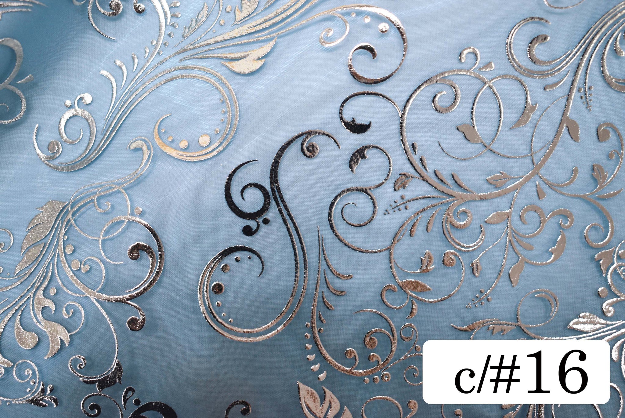 光沢のある薄手のオーガンジーに立体的なアラベスク柄の箔加工を施しました。