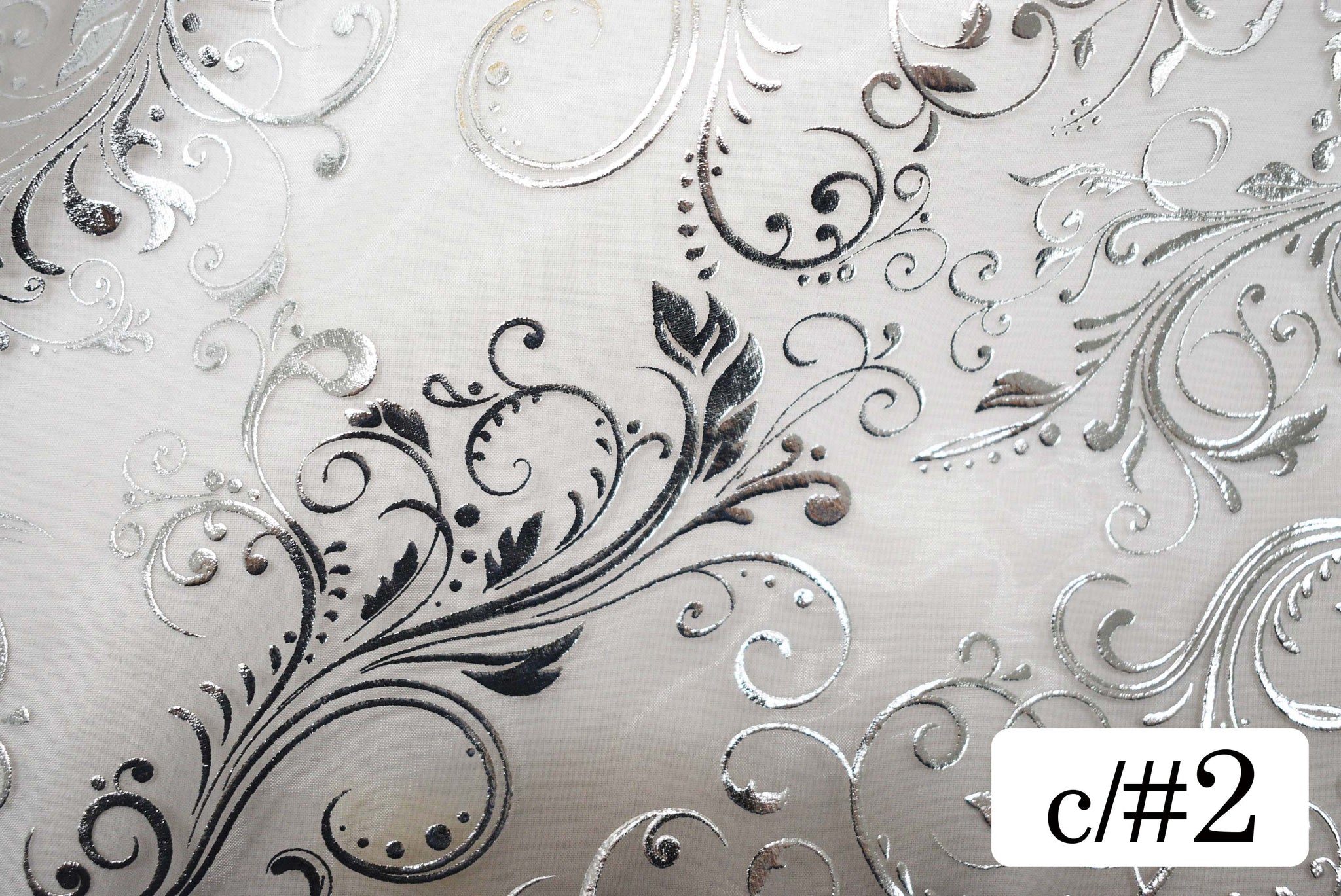 光沢のある薄手のオーガンジーに立体的なアラベスク柄の箔加工を施しました。