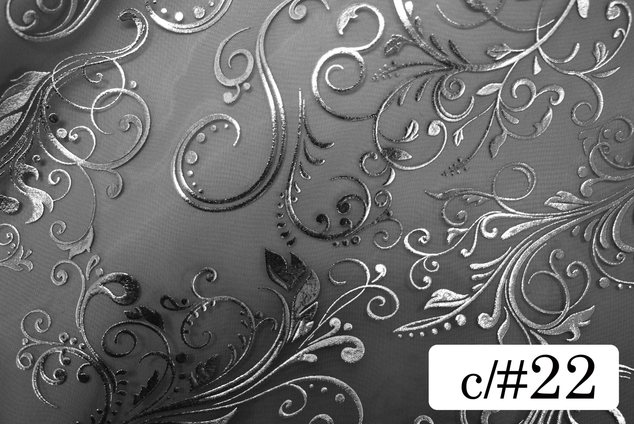 光沢のある薄手のオーガンジーに立体的なアラベスク柄の箔加工を施しました。