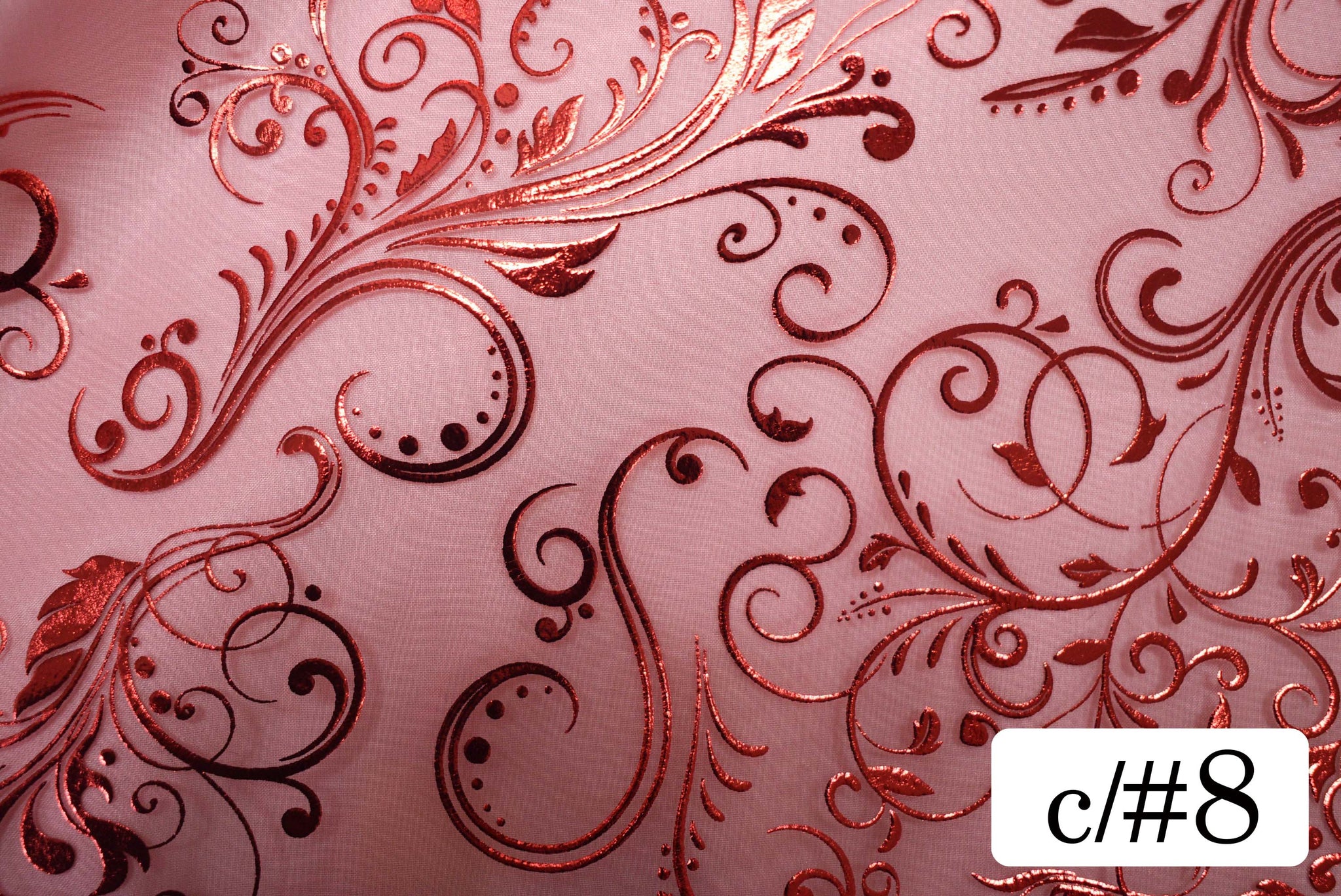光沢のある薄手のオーガンジーに立体的なアラベスク柄の箔加工を施しました。