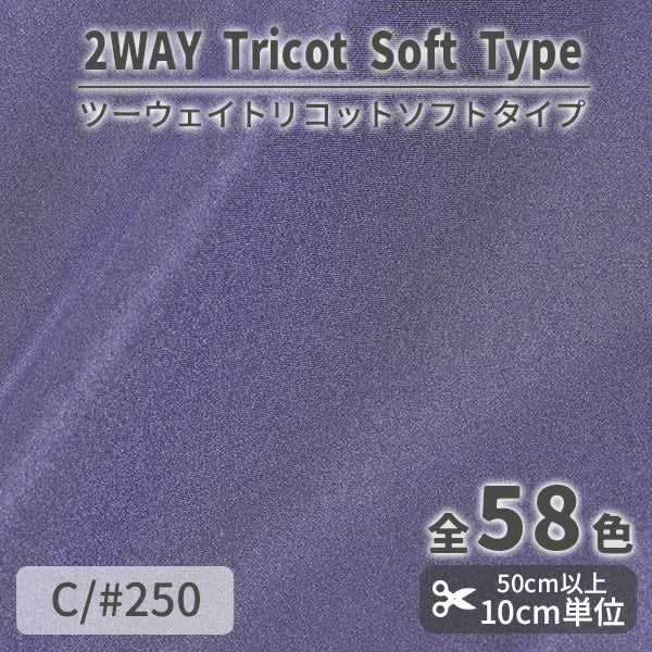品番489 2WAYトリコットに色数豊富なソフトタイプが加わりました。主に水着やレオタードに使用されます柔らかな風合いを持ち、縦横への伸縮性に富んだ素材です。多くの中間色を取り揃え、様々なシーンでのご利用を実現いたしました。