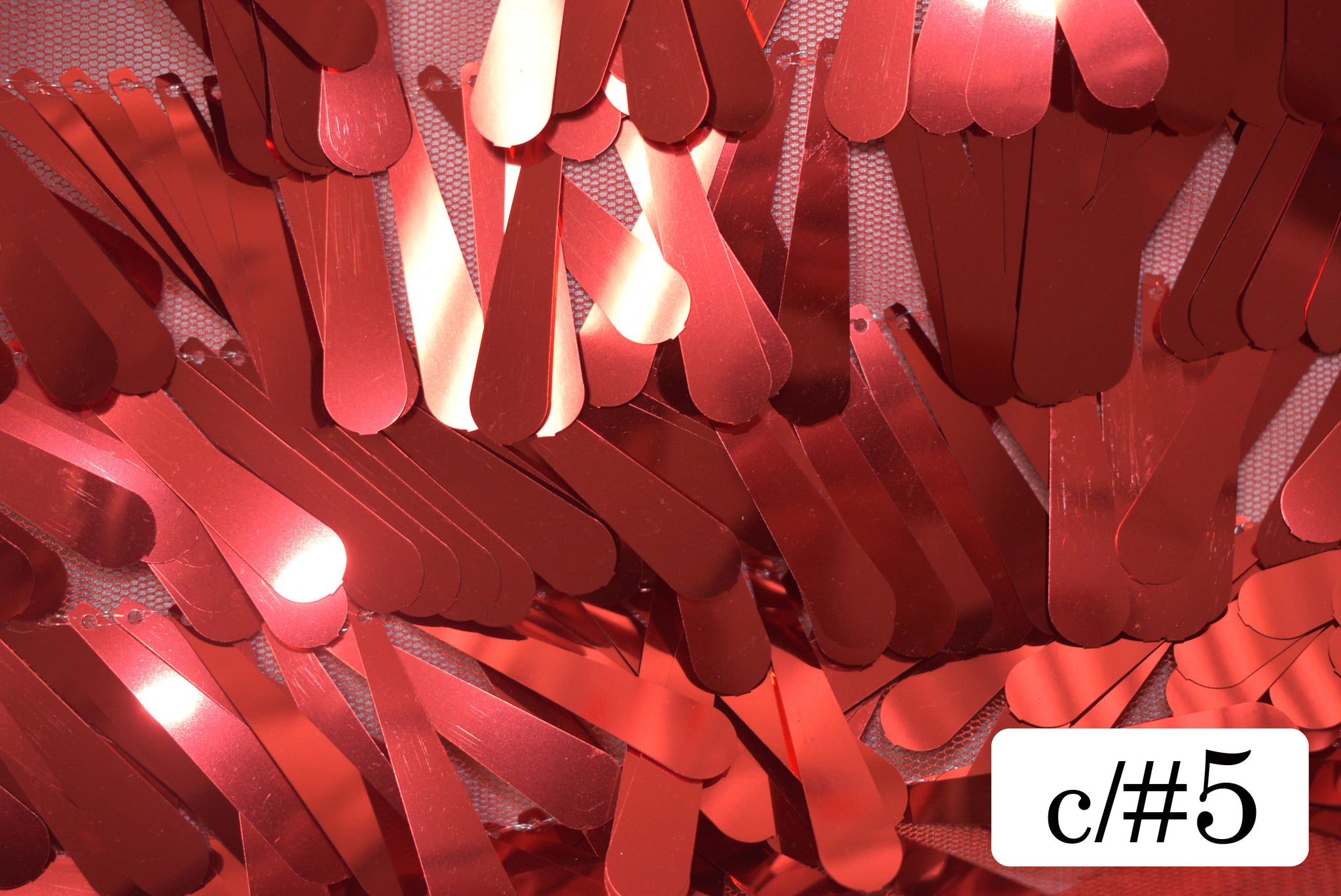 約4cmの細長いドロップ型スパンコールが魅力の素材です。わずかな動きでも大きく、ダイナミックに揺れ動くのが特徴です。動くたびに光を反射し存在感を放つデザインです。